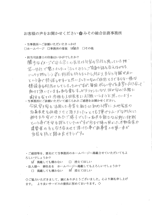 →今回、空き家を活用した事業を新たに始める際に、土地家屋の名義変更を依頼させて頂きました。とても丁寧でスムーズな対応に相手方も安心されたご様子でした。私共も新たな分野に挑戦という事で不安も抱えていたのですが、今まで縁の無かった不動産業や建築業の方と引き合わせて頂けた事で新事業への第一歩が自信を持って踏み出せそうです。