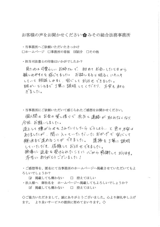当事務所へ何度も足を運んでくださり、誠にありがとうございました。T様のトラブル、ご心配事が解決された時の瞬間は、時間をかけて一緒に悩み考えさせていただいた結果だと私も大変嬉しく感じました。この度は誠にありがとうございました。